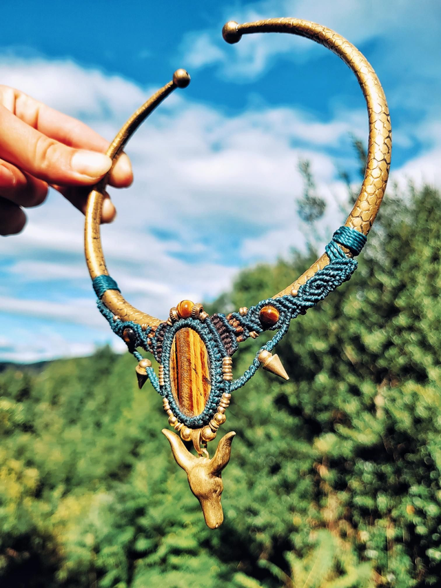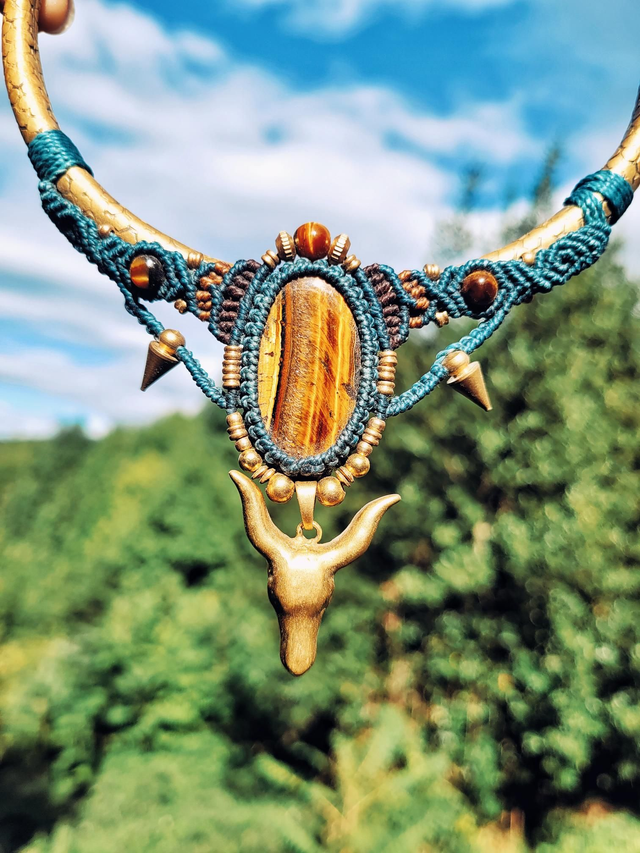 • Perles: perles laiton, oeil de tigre et torque,et tête de buffle en laiton aussi.