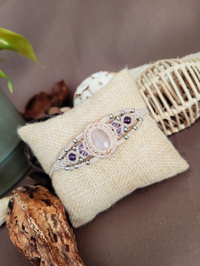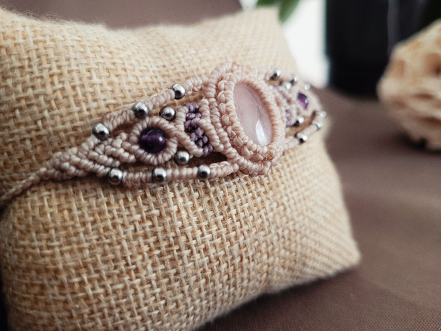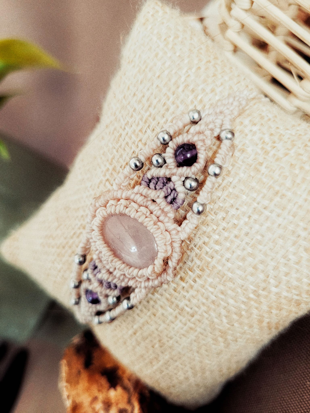 Manchette fine en micro-macramé, quartz rose et améthyste