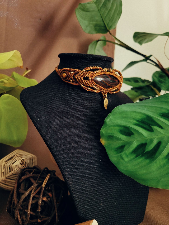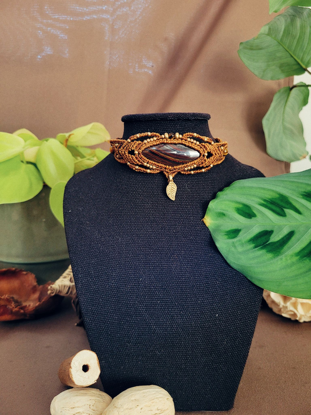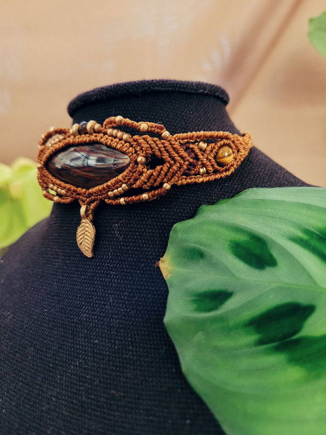 Ras de cou micro-macramé – pierre œil de fer et perles d’œil de tigre
