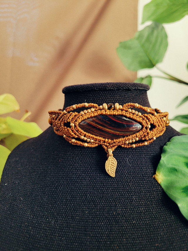 Ras de cou bohème micro-macramé – pierre œil de fer centrale